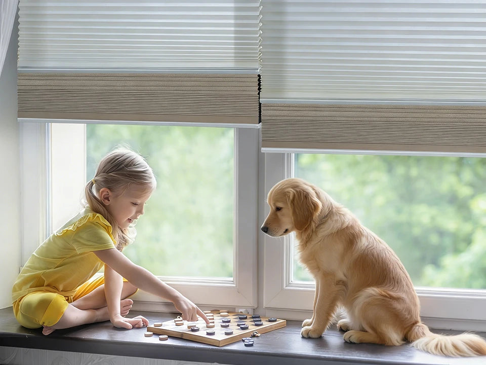 - Durable & Safe Design: Built with a robust drawstring system, our motorised day-night honeycomb shades operate smoothly and reliably. The adjustable fabric buttons prevent deflection, and the cordless design ensures safety for children and pets by eliminating exposed cords.