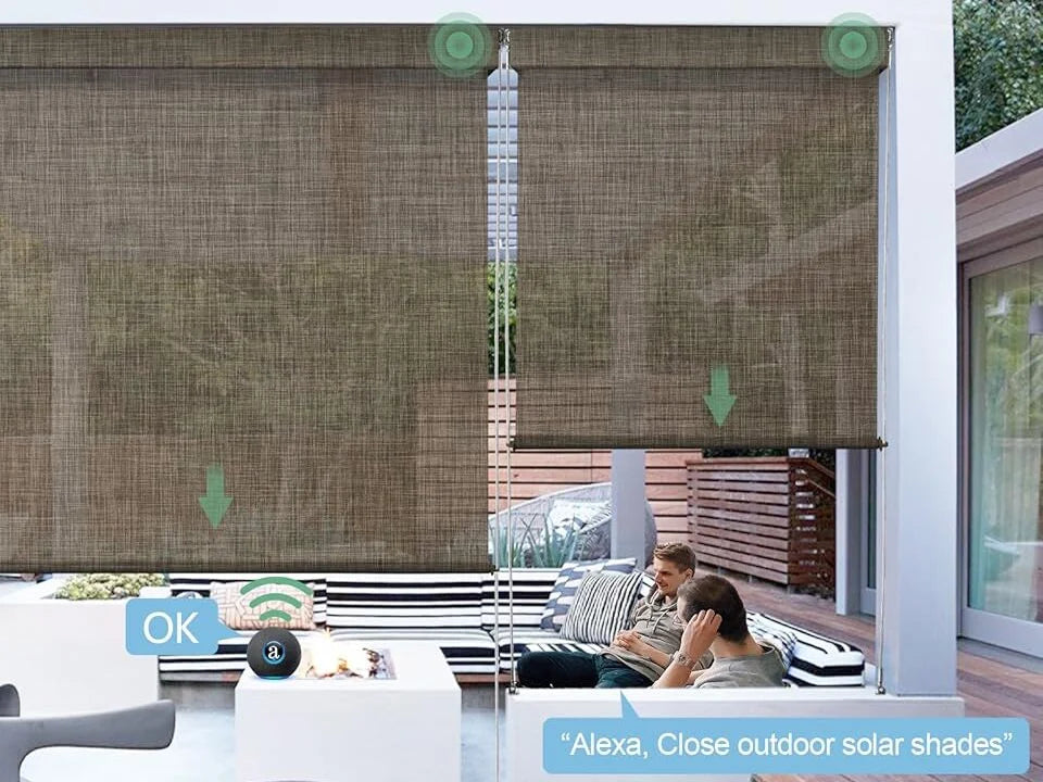 - Premium Material: Yoolax motorised outdoor roller blinds are made from premium 3% openness fabric, offering excellent light filtration and blocking 99% of harmful UV rays. Windproof, waterproof, and fire-resistant, these blinds feature a stainless steel wire guide system for wind resistance level 5, making them ideal for porches, pergolas, and patios.