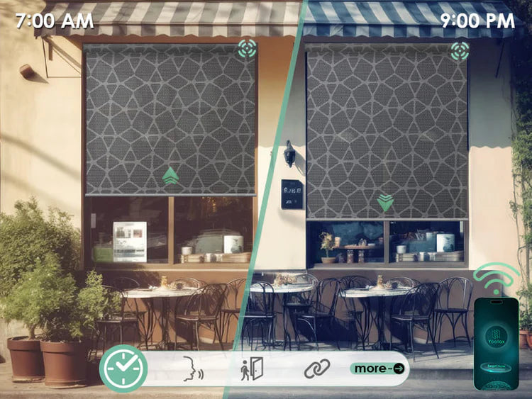 Yoolax motorised outdoor blinds are made of durable multi-functional fabric, which is fire retardant, waterproof and can effectively reduce harmful UV-rays. A range of fabrics with different colors and openness is waiting for you to choose.