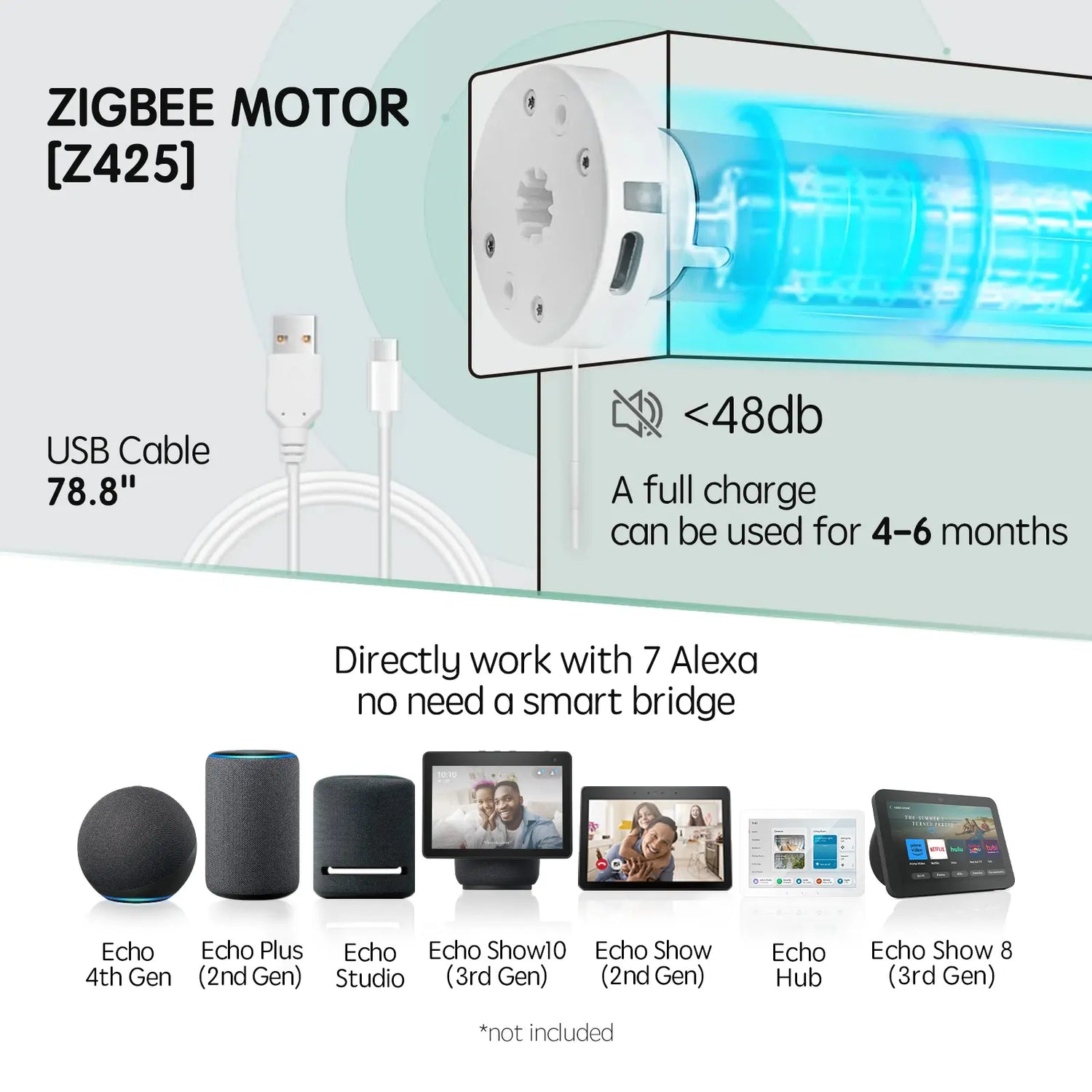 - Smart Zigbee Motor: The Zigbee motor can seamlessly connect with select Alexa devices (Echo Plus 2nd Gen, Echo Show 2nd Gen, Echo Studio, Echo Show 10, Echo 4th Gen, Echo Show 8 3rd Gen, Echo Hub, etc.). For other Alexa devices and Google Home, the Zigbee motor requires a hub.